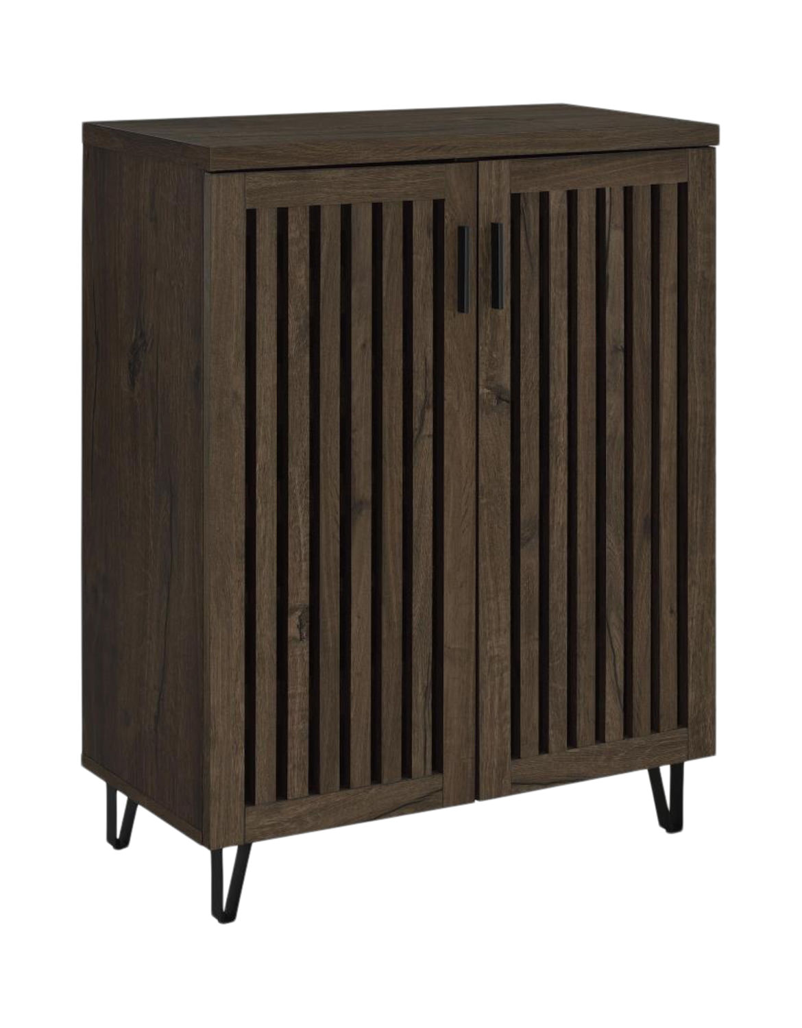 Introducing the Brixton Shoe Cabinet, brought to you by DOCK86! Keep your footwear organized and neatly tucked away with this stylish storage solution. The vertical slatted doors add a touch of sophistication, while the multiple adjustable shelves offer versatile storage options. With its smoked oak finish and warm natural look, this shoe cabinet will complement any décor. Easy on the eyes and functional too, this piece requires customer assembly and features sleek black handles and metal legs. Upgrade your entryway or bedroom with the Brixton Shoe Cabinet from DOCK86! Customer assembly required.