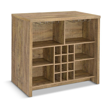 Introducing the Mendoza Home Bar by Dock86, a perfect blend of function and flair for your entertaining space. This stunning piece features a striking herringbone pattern in a warm oak finish, adding a rustic charm to your home décor. With ample bottle and stemware storage, you'll have everything you need to host your guests in style. The Mendoza Home Bar is designed to bring elegance and convenience to your home entertaining setup. Please note, customer assembly is required. Elevate your hosting experience with the Mendoza Home Bar from Dock86.