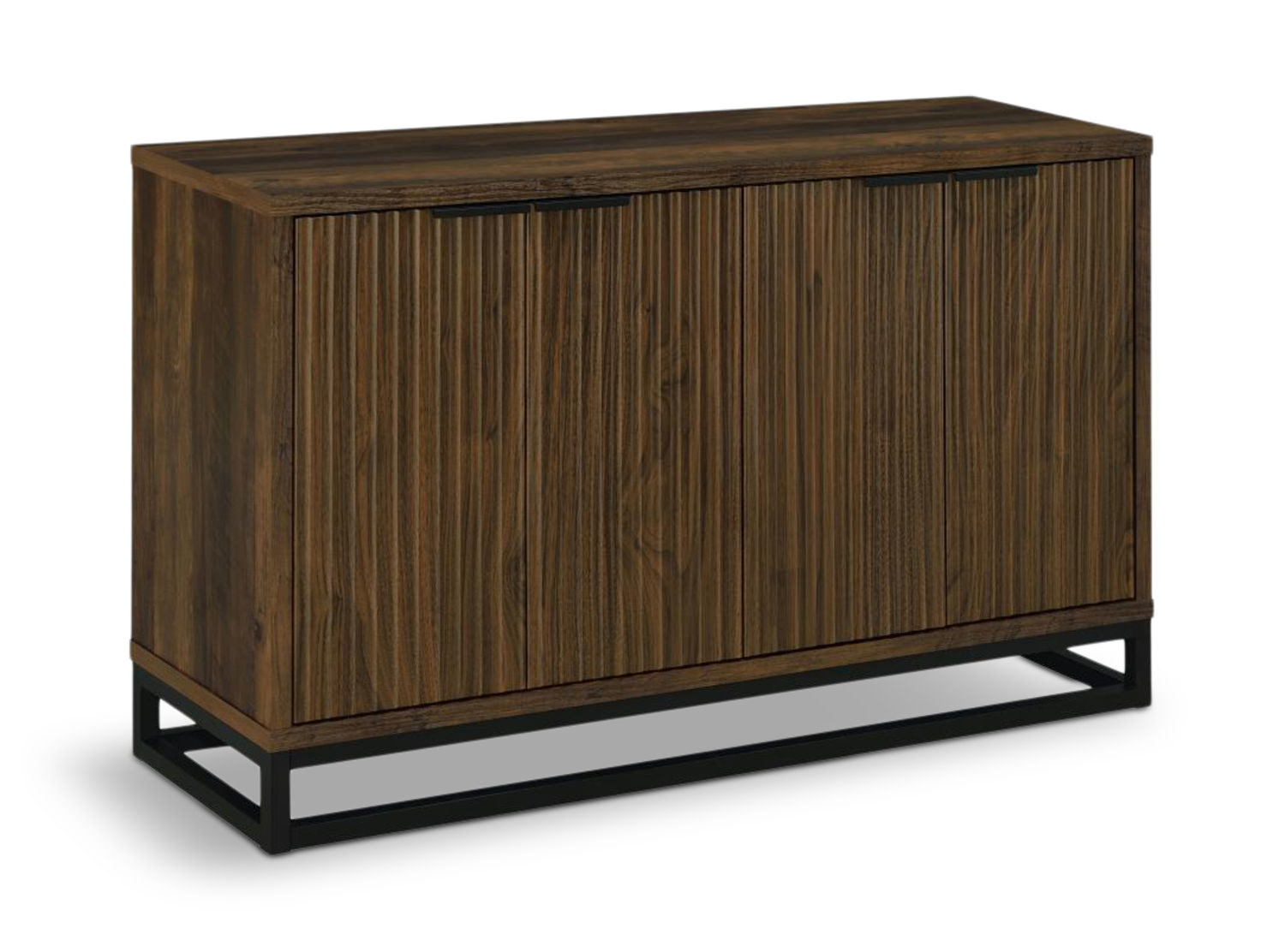 Introducing the Ryatt Accent Cabinet by DOCK86! Embrace rustic beauty with a dark pine finish and a hint of industrial flair. The carved fluted door fronts add a touch of elegance to this cabinet. With four doors that open to reveal storage on two fixed shelves, you'll have plenty of space to keep your essentials organized. The black metal cross-bar base not only adds a modern touch but also ensures sturdiness. Please note, customer assembly is required to bring this stunning piece into your home. Add a touch of sophistication and functionality to your space with the Ryatt Accent Cabinet from DOCK86! Customer assembly required.