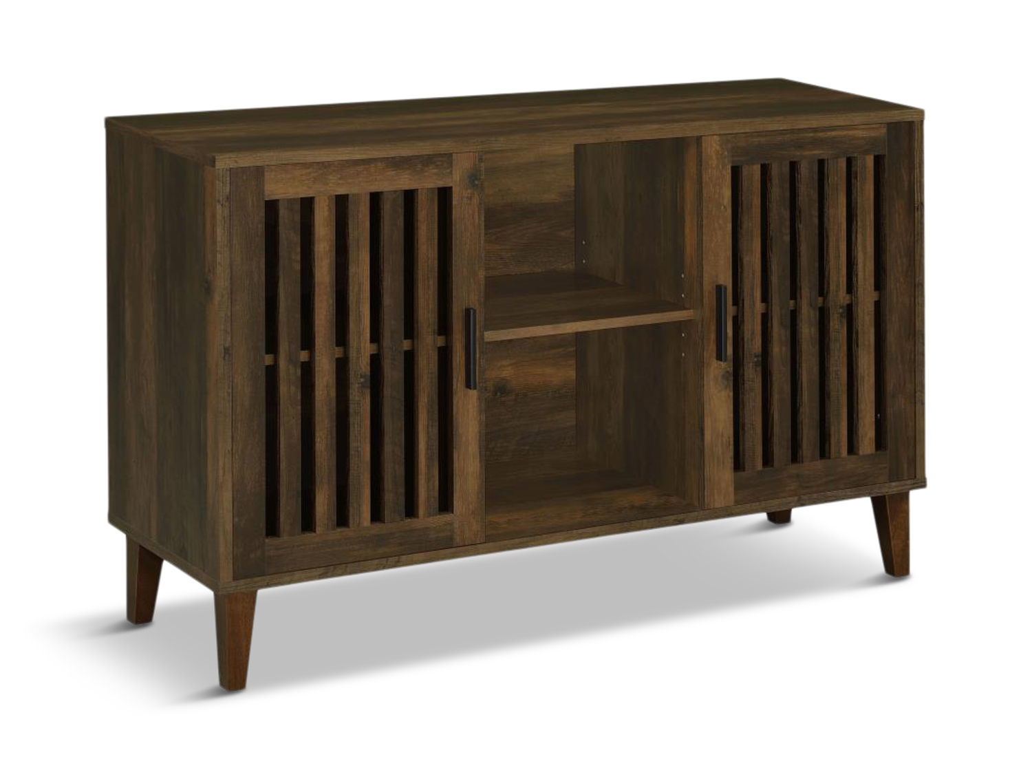 Introducing the Torin Accent Cabinet by DOCK86! This charming piece combines bold farmhouse industrial style with a sleek dark pine finish, making it the perfect addition to your dining or medium-sized space. The slatted panel door fronts add a touch of rustic charm, while the two center compartments are ideal for storing your large serve ware items. With two shelves creating four interior compartments, this cabinet offers ample storage space for all your essentials. Please note that customer assembly is required. Upgrade your décor with the Torin Accent Cabinet from Dock86 and add a touch of style to your home!