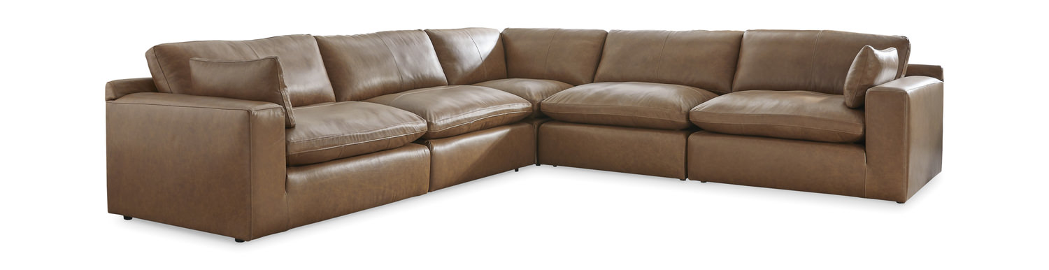 Experience the epitome of luxury and comfort with the Celine 5 Piece Leather Sectional from DOCK86. Crafted with a feather/fiber blend and foam cushion, this sectional offers a deep seating experience that invites you to sink in and relax. The multiple configurations allow you to customize your living space to suit your needs perfectly. Indulge in the rich feel of 100% top grain leather on the seats, complemented by vinyl match on the sides and back for a sophisticated touch. The plush cushions and platform foundation system ensure lasting comfort and support, while the engineered hardwood frame guarantees durability for years to come.