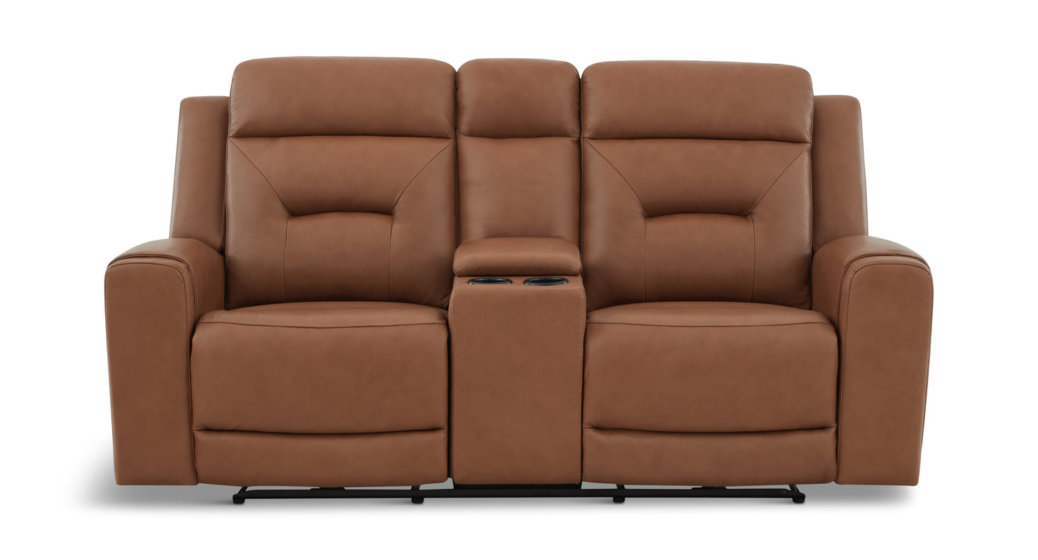 Introducing the Jackie Leather Power Reclining Loveseat with Console from DOCK86, where luxury meets functionality. Crafted with a blend of 100% top grain leather on the seats and durable vinyl on the sides and back, this loveseat exudes sophistication and elegance in a rich brown hue. Built on a sturdy frame with a heavy-duty mechanism, the Jackie loveseat ensures durability and longevity. The power-adjustable headrest allows you to find the perfect position for ultimate comfort, while the high-resiliency cushions provide plush support for hours of relaxation.