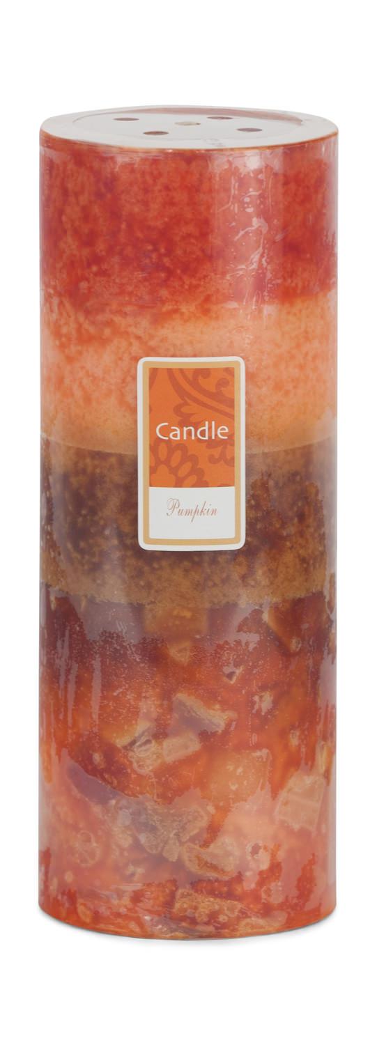 Set an inviting tone in your home with the addition of the Orange Pumpkin Pillar Candle. This candle has a warm pumpkin scent and has tiers of different colored wax in a variety of orange tones. Use one of these orange candle options atop of a decorative candle holder in a living room to create a cozy vibe during those long winter nights, or add a couple different sizes to a decorative plate on the center of a coffee table. The scent of this orange candle will permeate through your home and the flicker of the candles will add a delightful and relaxing tone to your space. There are three sizes available so you can create an appealing display with varying heights of the Orange Pumpkin Pillar Candle in almost any room of your home. Be sure to always place the pillar candle on a protective surface and never on top of a piece of furniture.
