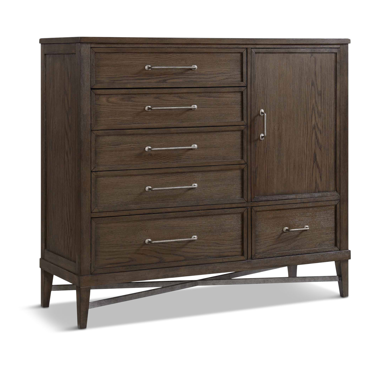 Introducing the Shadow Ridge Chest - a stunning blend of classic elegance and modern functionality! This chest features antiqued bronze hardware and metal accents, adding a touch of sophistication to any room. Crafted from oak veneers and select hardwoods, this piece is both durable and stylish. The ball bearing drawer glides ensure smooth opening and closing, while the dark finish exudes a sense of timeless charm. With its traditional style and rich brown color, the Shadow Ridge Chest is the perfect addition to your home. Upgrade your storage space with this high-quality chest!