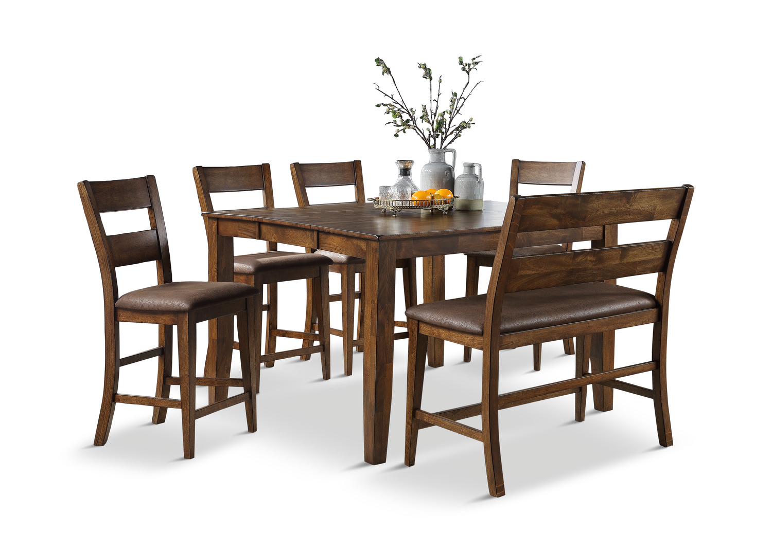 Upgrade your dining experience with the Camden Counter Table from DOCK86. Crafted from solid mango wood in a warm brown finish, this transitional-style table exudes elegance and charm. The 54" square top easily seats 6 guests, with the option to extend it using the convenient 18" butterfly leaf. Standing at a counter table height, this piece is perfect for casual meals or entertaining friends. Accompanied by 4 matching chairs and a bench, the Camden Counter Table set offers comfortable seating for 4 to 6 people. Elevate your dining space with this stylish and functional furniture set.