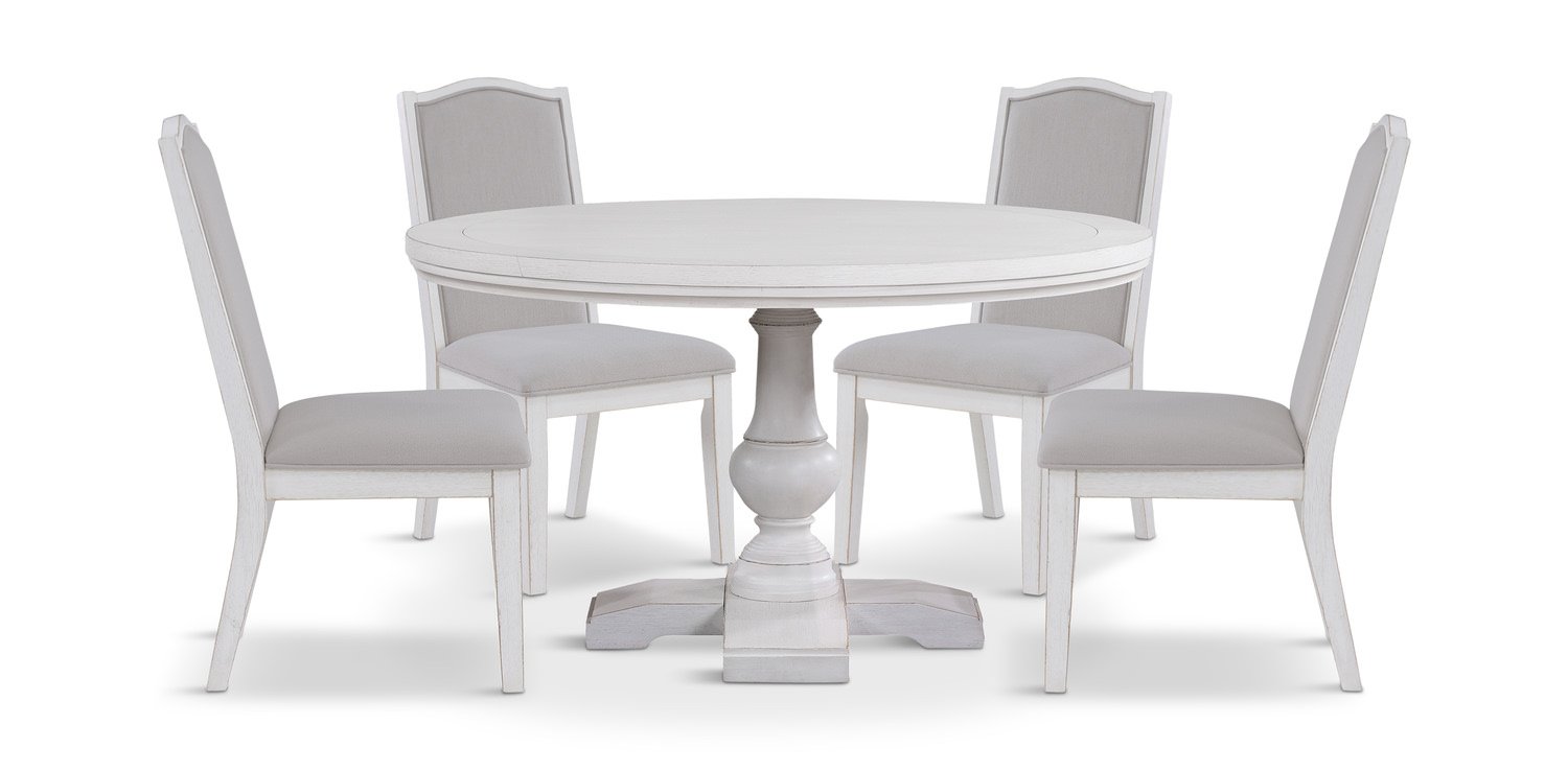Upgrade your dining space with the charming Sophie Dining Table With 4 Chairs from DOCK86. Crafted with a farmhouse style in mind, this set features beautifully distressed, hand-stained chairs upholstered in a combination of oak veneers, acacia, mango, and Asian hardwoods. The light finish exudes a warm and inviting feel, perfect for family gatherings and cozy meals. The round shape makes it ideal for seating 4 to 6 people comfortably. In a classic white color, this set adds a touch of elegance to any room.