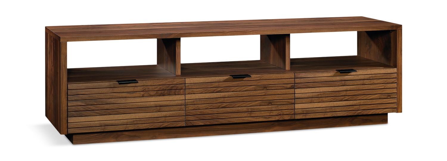Upgrade your entertainment space with the Harvey Park 71" Media Console from DOCK86. This sleek and modern piece features three spacious drawers with smooth metal runners, perfect for storing all your media essentials. The console also includes three large cubbies, ideal for displaying your favorite decor items. Designed to accommodate up to a 70" TV weighing 95lbs or less, this media console is not only stylish but functional as well. This piece will effortlessly blend into any modern living room. Please note that customer assembly is required.