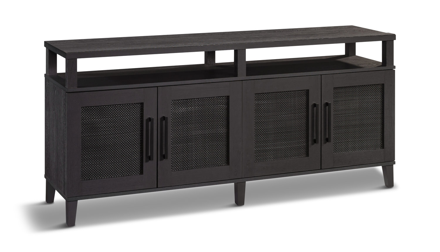 The Tiffin 65" Media Console from DOCK86 offers a sleek and modern storage solution for your entertainment needs. With two adjustable shelves, storage behind doors, and a large open shelf, there's plenty of space to organize your media essentials. This black media console can accommodate TVs up to 65" and 95lbs, with an enclosed back featuring a pass-through for cord management. Customer assembly is required to set up this stylish and functional piece for your living space.